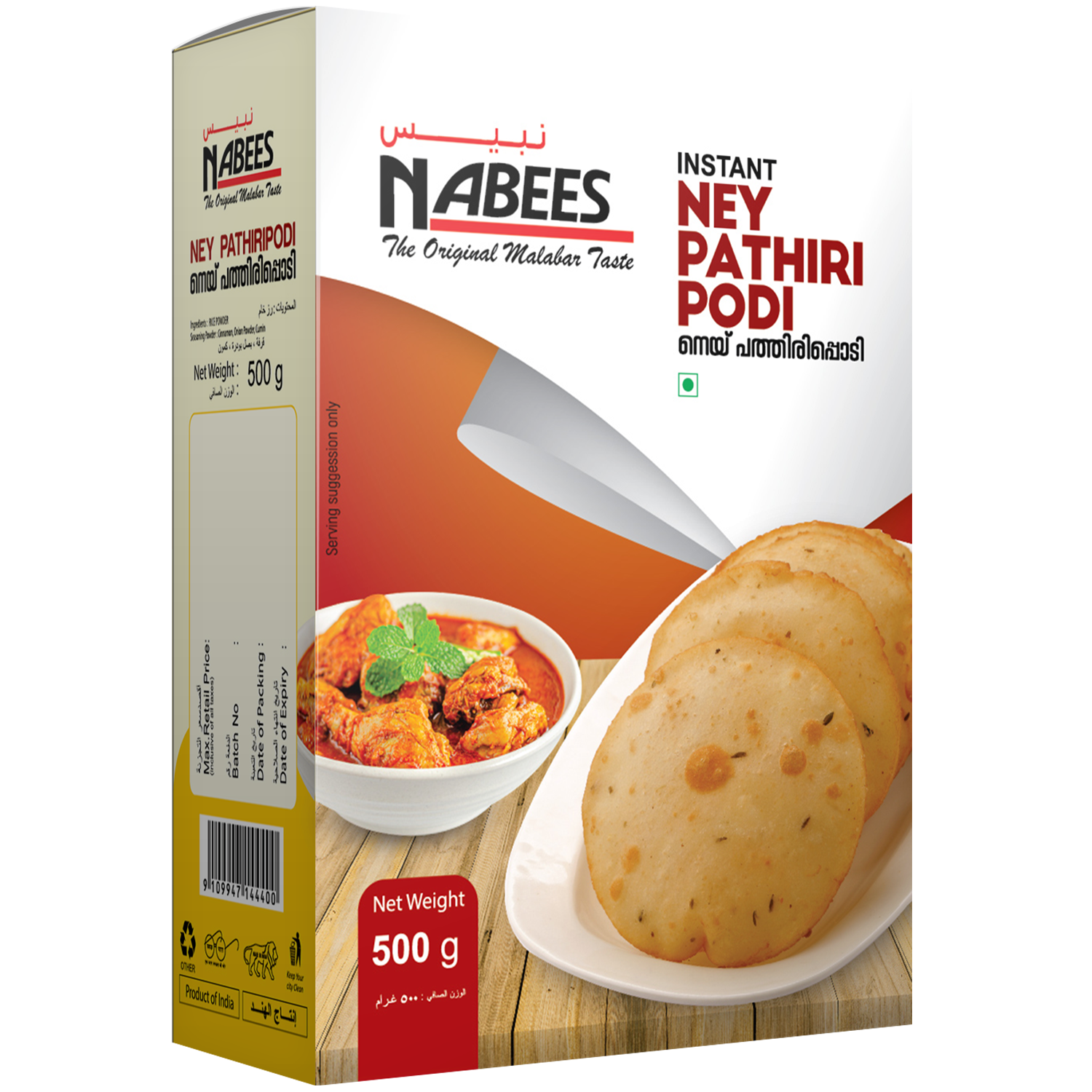Nabees Ney Pathiri Podi is made from superior quality rice to give you that super delicious & rich Malabar taste. Our products are perfected and packed after extensive research and insights into the markets. Bring home the taste of Malabar and enjoy delicious Ney Pathiri from wherever you are with Nabees Instant Ney Pathiri Powder.